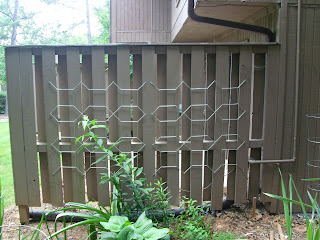 And of course, my newest installation, the trellises. I'll be putting the moonflowers down along the fence so they can grow onto the trellises, and as I said, trading a few moonflowers for some climbing roses, who will also be using the trellises.
